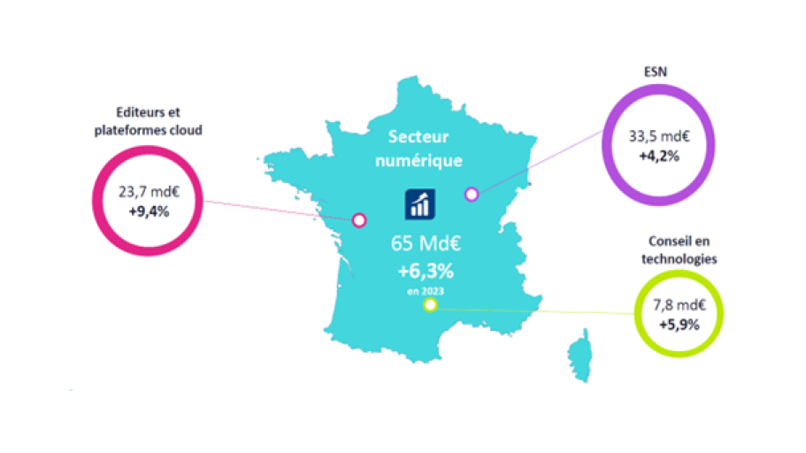 En 2023, la taille du marché du numérique est ainsi évaluée à 65 milliards d’euros : 36,5% du marché pour les éditeurs de logiciels et les plateformes cloud avec 23,7 milliards d’euros de chiffre d’affaires, 51,5% du marché pour les ESN avec 33,5 milliards d’euros et enfin 12% pour les activités de Conseil en Technologie avec 7,8 milliards d’euros.