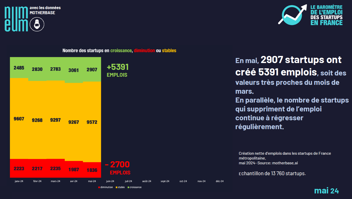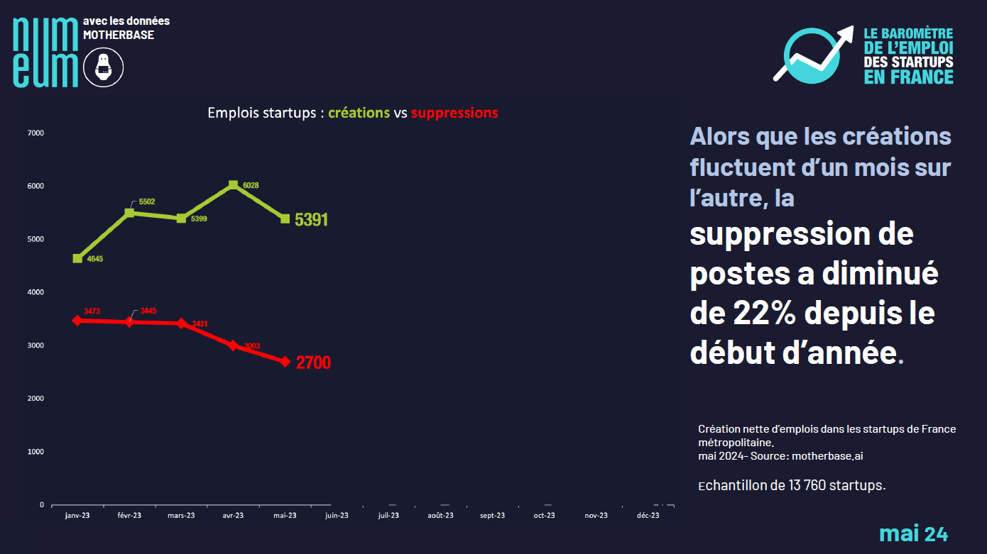 The main reason for this positive momentum is that French startups are shedding fewer and fewer jobs every month. This decline is constant and now represents a 22% drop compared to the beginning of the year. As for job creations, trends fluctuate sharply from month to month. And if the dynamic is less positive in May than in April, it’s precisely because job creations are back to their March level. In other words, down 10.6% on April.