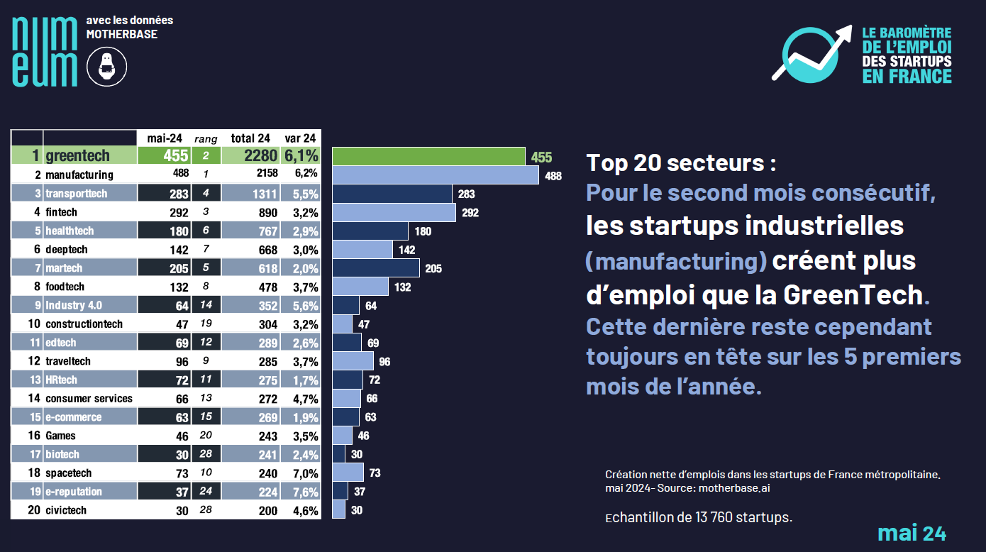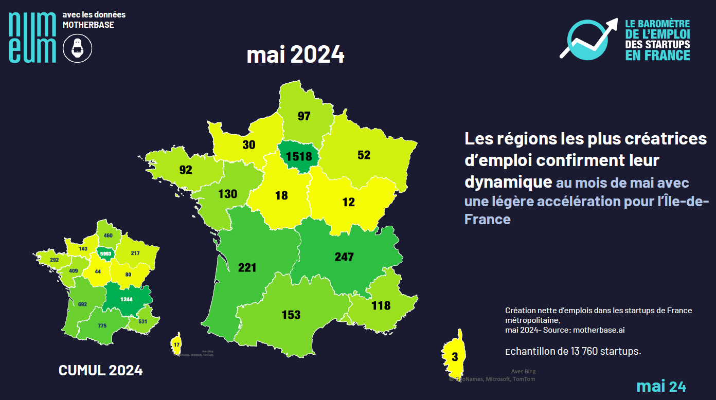 In terms of regions, Île de France accelerated to generate over 1,500 new jobs in May (56% of the national total). This represents an increase of 0.2 points on the previous month. It should be noted, however, that the proportion of jobs created by startups in the Paris region remains, for the moment, relatively lower than in previous years. As a reminder, this share was 58% for the whole of 2023 and 66% for 2022.